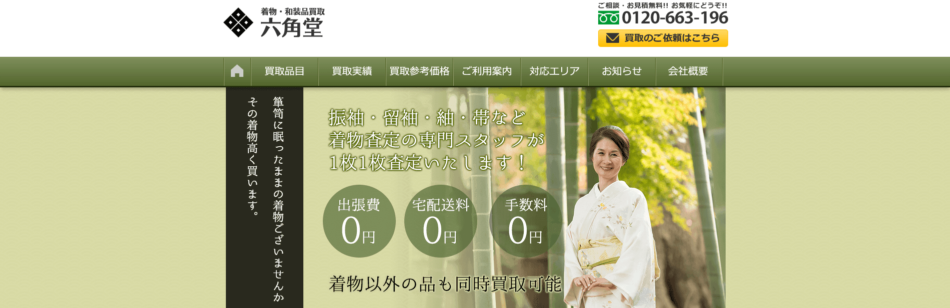 六角堂は出張買取と宅配買取に対応している着物買取専門店です。着物専門の買取業者のため着物の知識が豊富で、実績も豊富です。ホームページでは高く買い取ってもらうためのコツも紹介しています。着物以外の品も買取可能です。