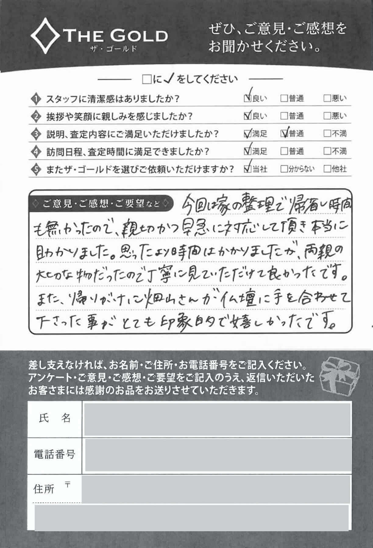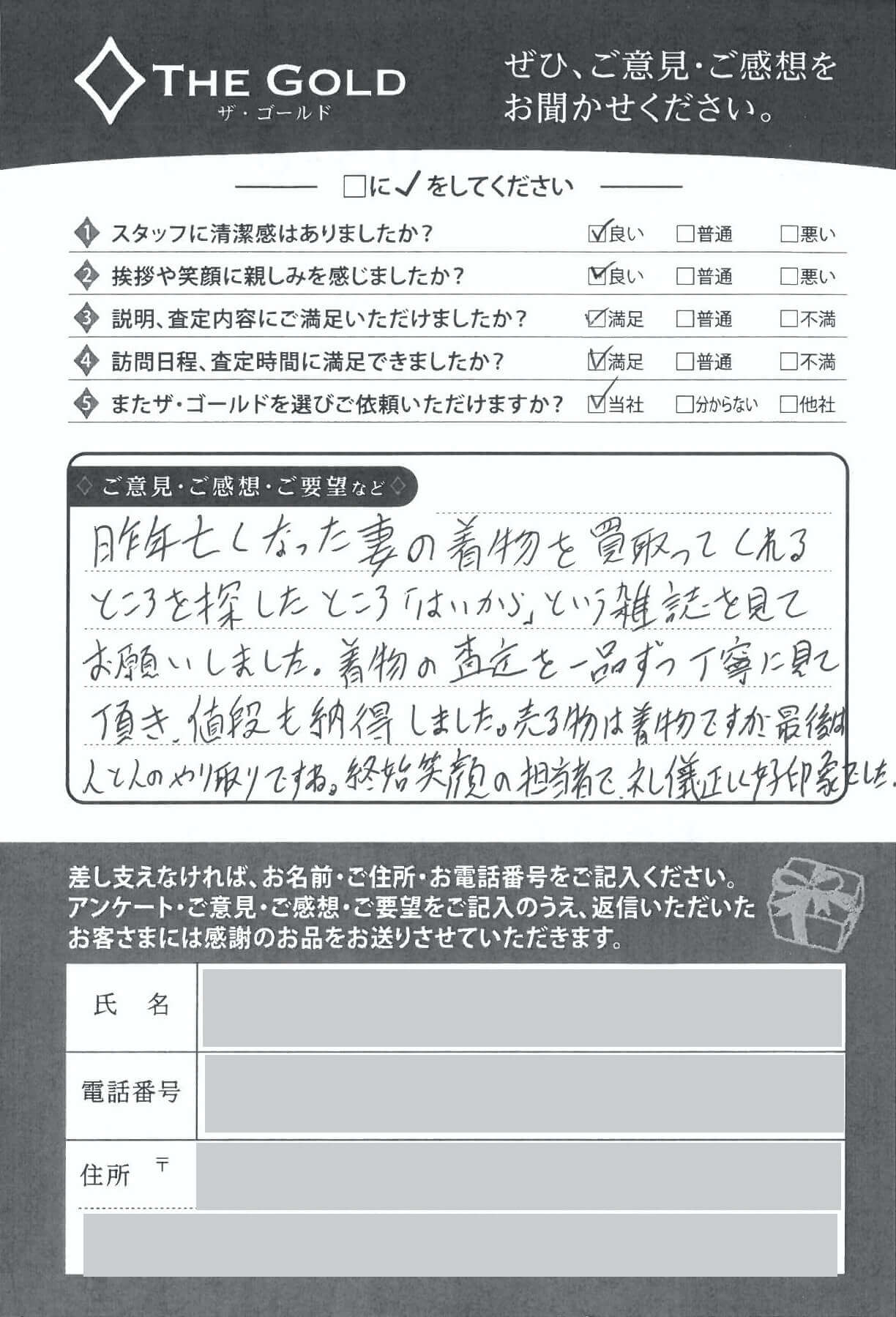 母が昔着用していた着物等を出張買取をお願いし、自分が思っていた以上の査定を出して頂きました。査定に含まれなかった生地も引き取って頂き違う形(物)となって産まれ変わって使って頂けたら嬉しいと思っています。